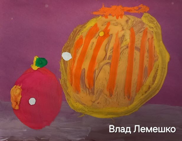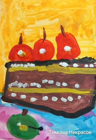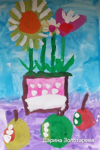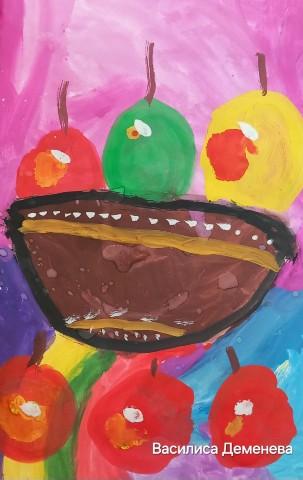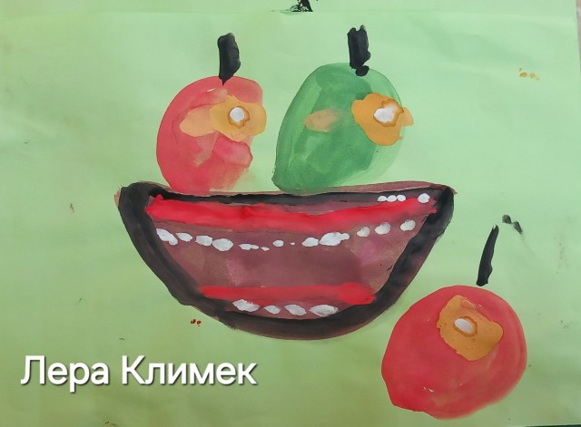 Лиза Т.,6л. "Натюрморт с яблоками" (гуашь, мятая бумага). | |
